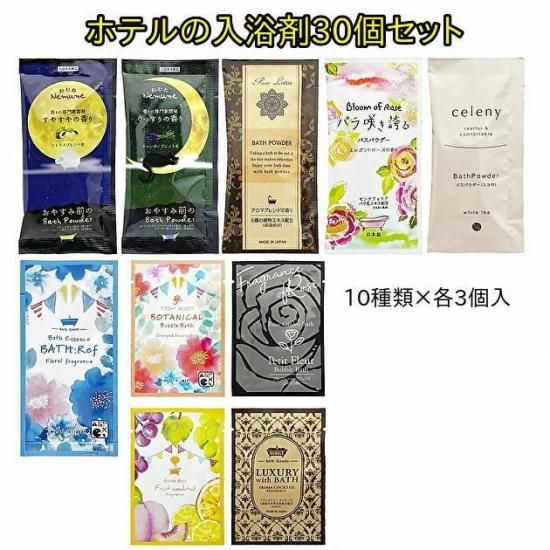 ホテル・旅館の客室用アメニティとして使用されている入浴剤の詰め合わせ30個セットです。